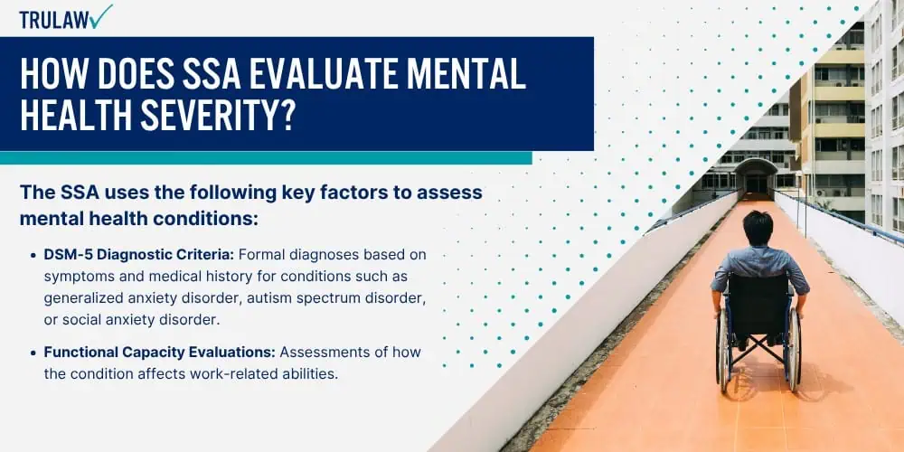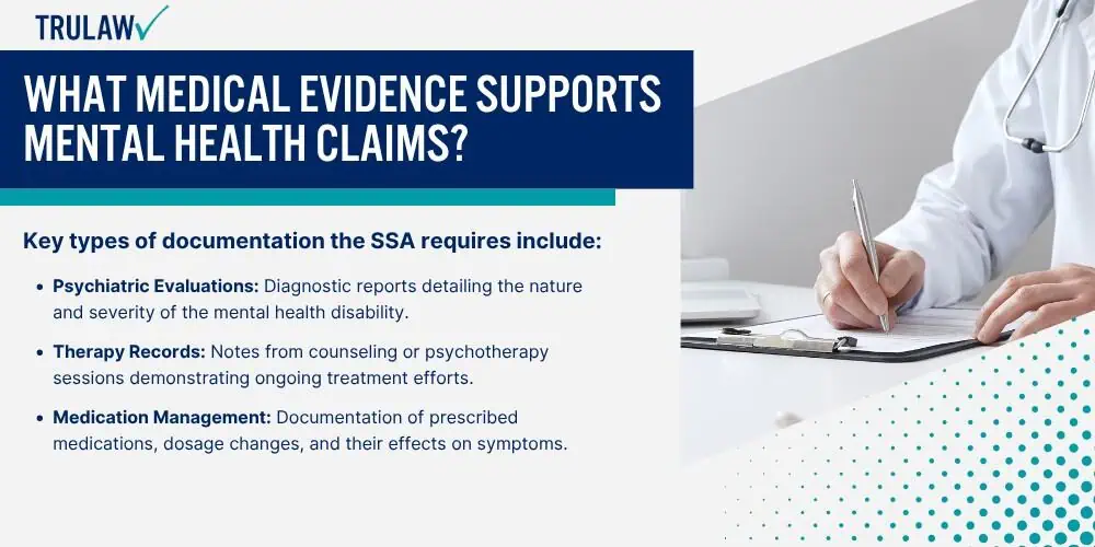 The Social Security Administration (SSA) relies on clinical evidence from mental health professionals to evaluate claims, including psychiatric evaluations, therapy records, and medication histories.