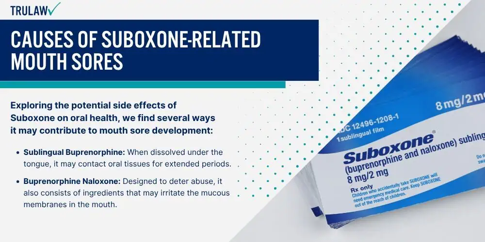 Causes: Suboxone films can alter the oral environment, leading to changes in pH levels and bacterial balance and contributing to the development of mouth sores.