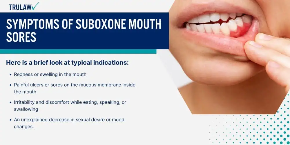 Symptoms: Suboxone mouth sores can cause pain, burning sensation, redness, and difficulty eating or drinking.