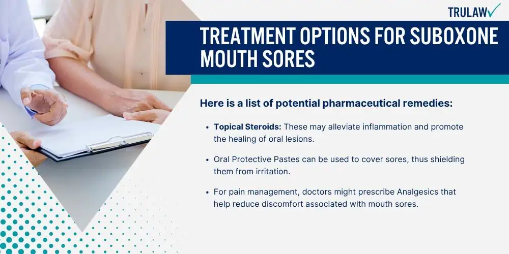 Treatment options for Suboxone mouth sores include medications to fortify the oral environment, dental interventions to mitigate adverse effects, and lifestyle modifications to reduce the risk of developing sores while continuing addiction treatment.